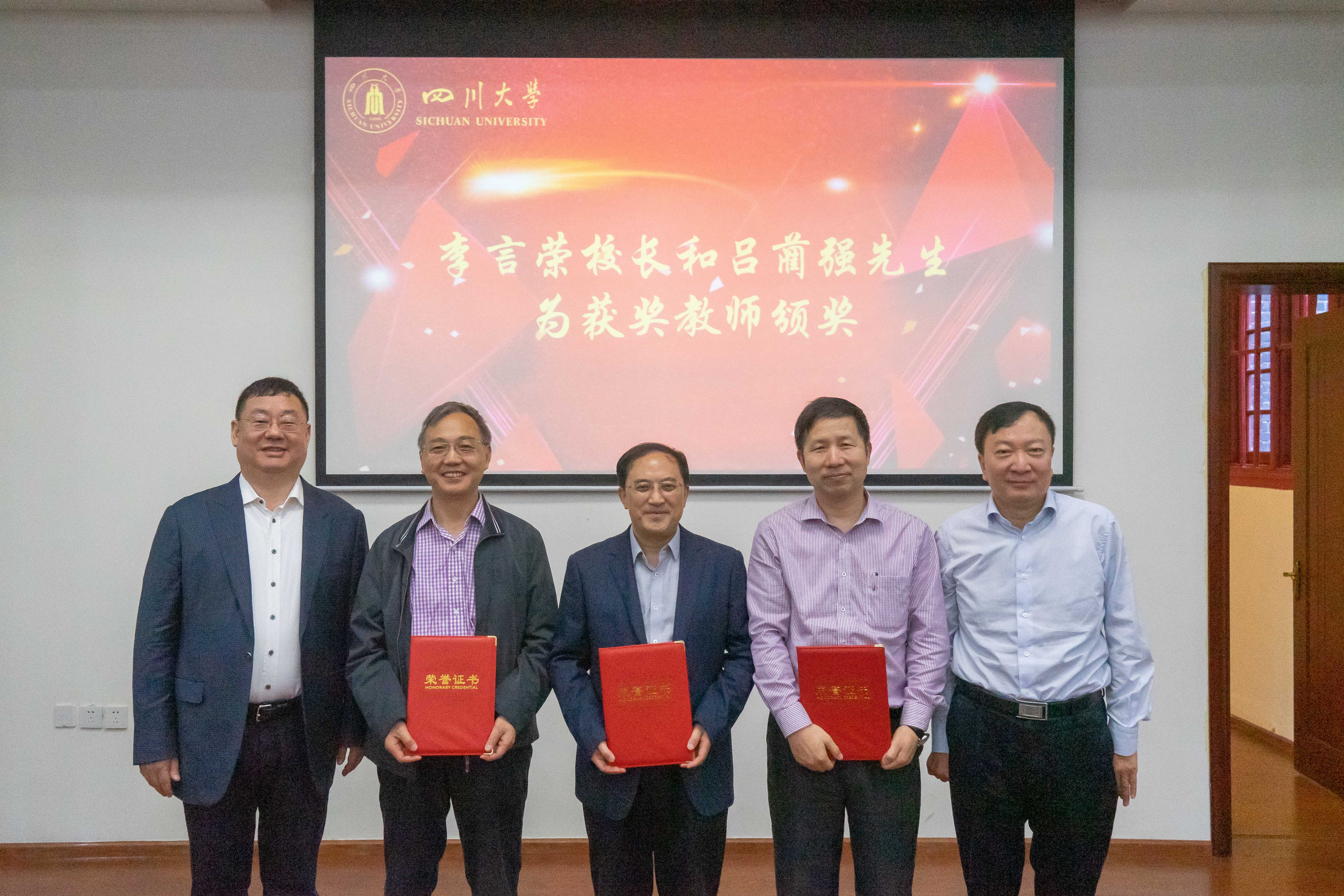 随后,李言荣校长和吕蔺强先生为荣获顺通奖教金的冯小明院士、王玉忠院士、胡常伟教授颁奖。胡常伟教授作为获奖代表发言。胡常伟教授首先代表三位获奖老师向四川顺通实业有限公司及吕蔺强先生对学校和学院发展的支持表示感谢,他说自己将继续努力,为学校双一流建设添砖加瓦,为化学学科的进一步发展竭力工作。
