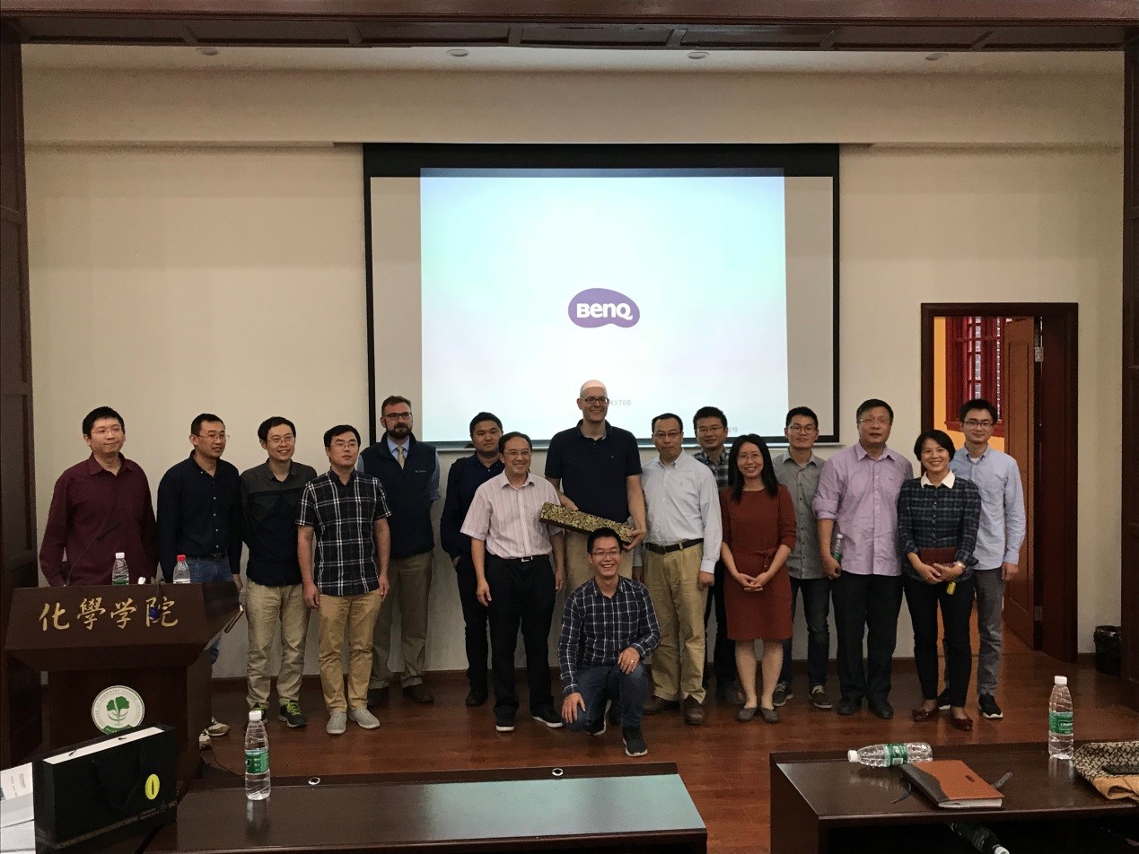 在报告中,Glorius教授重点介绍了他们课题组在探索新化学过程中的策略和心得。他首先介绍了在氮杂卡宾催化领域相关的研究进展,如:氮杂卡宾在金属表面的化学及其在模拟生物膜方面的应用,以及氮杂卡宾在芳烃氢化方面的研究工作。此外他还介绍了他们课题组在可见光催化领域的一些进展。最后他以光催化过程为例,介绍了基于机理认识的高通量筛选方法的应用。整场报告内容丰富,Glorius教授讲解形象生动,深入浅出,使师生获益匪浅。在随后的自由提问环节,在座师生与Glorius教授进行了热烈而深入地讨论交流。报告在热烈的掌声中落下帷幕,结束后部分老师与Glorius教授合影留念。