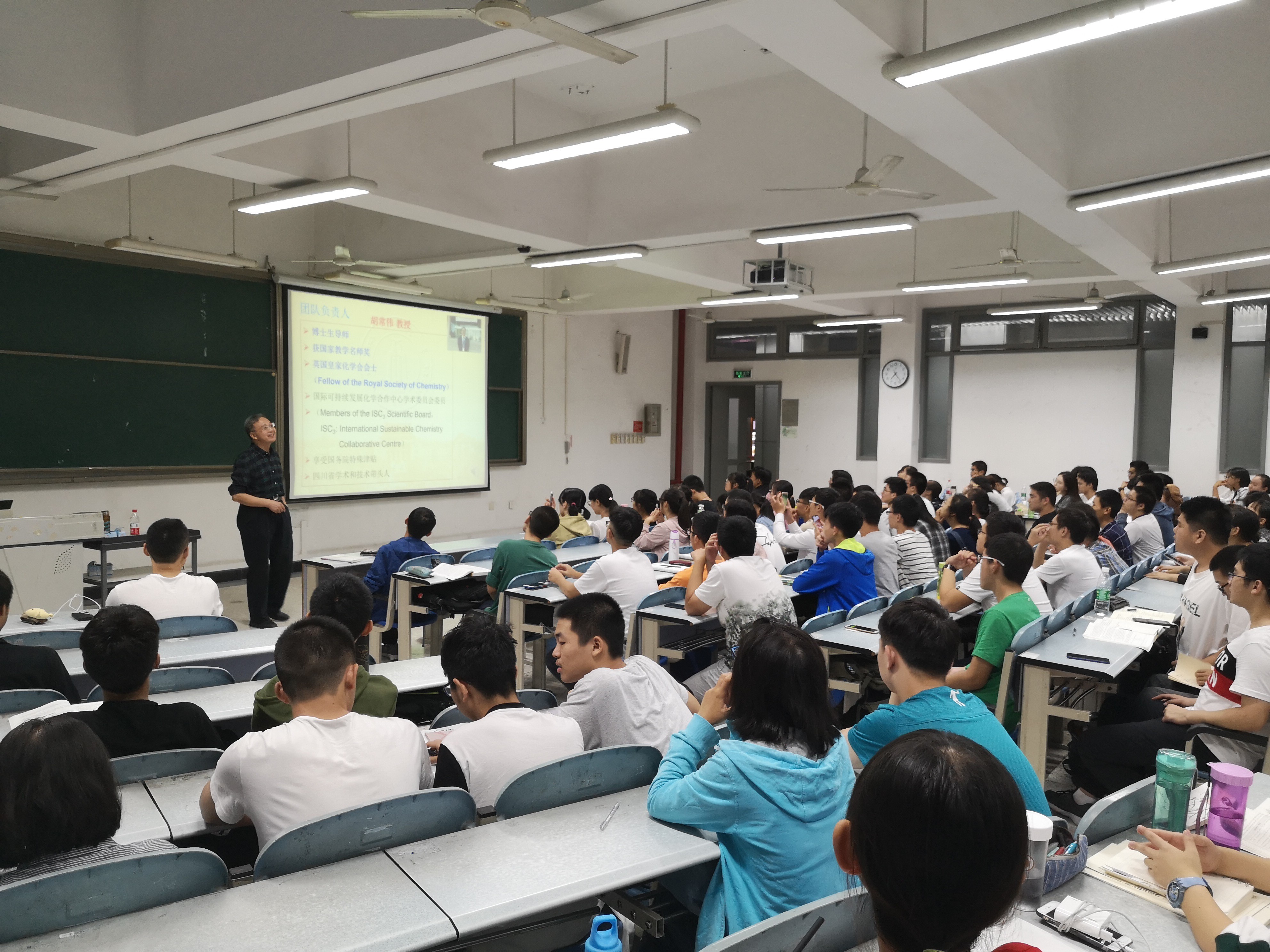 首先,胡老师以“修身立业,跨越创新”为题,展开了本次讲座,用风趣幽默的语言吸引了同学们的兴趣,从“研究性大学对学生的要求”这一方面,介绍了大学生活与中学生活的异同点,让同学们知道了怎样更快适应大学生活,并结合一些古今案例,给同学们阐述了做人的道理与人际交往的重要性。除此,胡老师还以“绿色化学中的科研创新”为中心,结合自身的科研经验,讲述了化学与环境应和谐发展,人与自然相互依存,不可分割。在讲座结束前,胡老师还与同学们亲切交流,为本次讲座画下圆满句号。