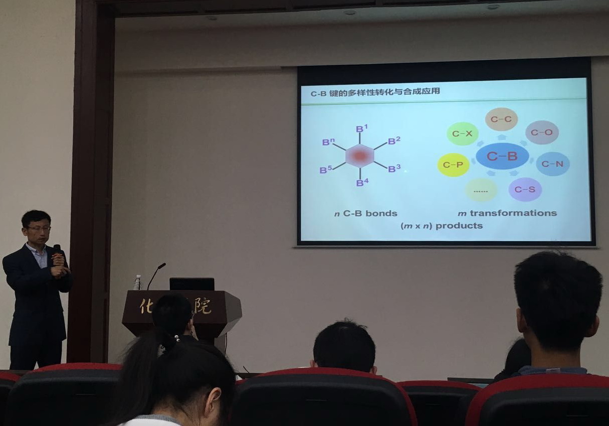 并进行了学术交流。在化学馆321报告厅,李鹏飞教授详细介绍了该课题组的流动式光反应绿色合成芳基硼化合物研究工作,多硼试剂的制备及其选择性氧化偶联;随后,李教授报告了他们课题组在Tiglianes和daphnane类天然产物[5,7,6]并环的构建方面的最新进展。此次报告会由巴卡漫画