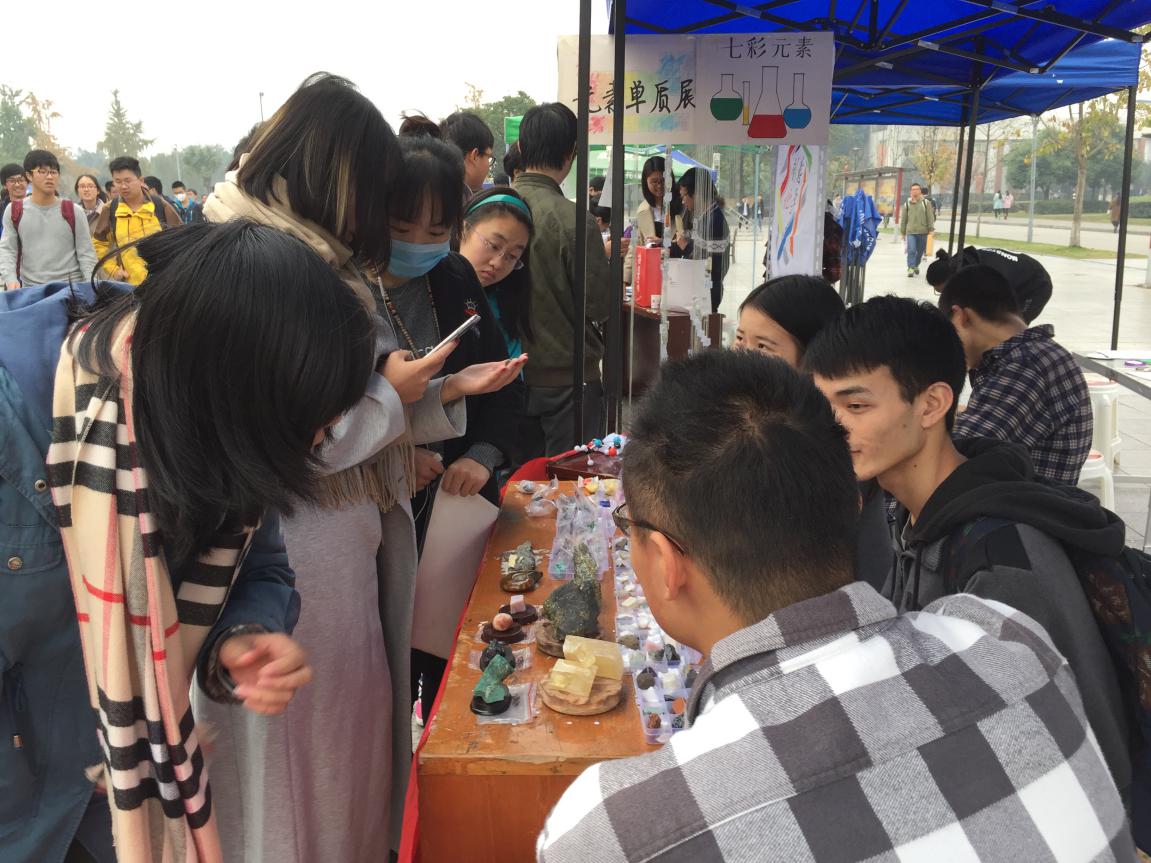 这次活动主要由白天的矿石展和元素展,以及七彩溶液,晚上的荧光灯会和稀有气体放电试验,现场演示实验如熔岩灯等组成。来观看此次活动的同学非常多,他们对化学元素以及矿石表现出了极大的兴趣,他们还询问志愿者们这些元素的由来和用途。