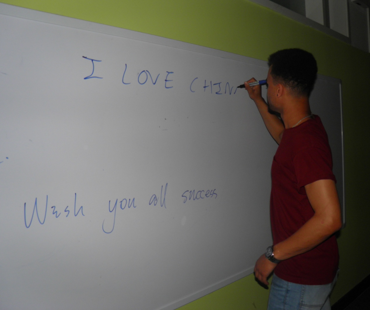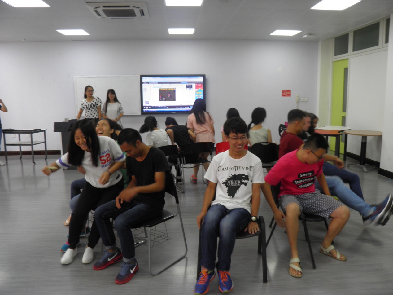 活动分为四个部分:乒乓球传递、你画我猜、手忙脚乱抢凳子、终极任务PK。乒乓球传递、你画我猜游戏里,大家开动脑洞,配合默契。手忙脚乱抢凳子游戏,全体成员在beat it的强劲节奏下共同参与其中,大家姿势各异、表情搞怪,游戏过程中充满了欢声笑语,活动进入高潮。最后的团队终极任务PK,各小分队分别展开行动,争分夺秒完成各项指定任务,最后大家在黑板上写上对留学生的祝福和活动感想,并合照留念。