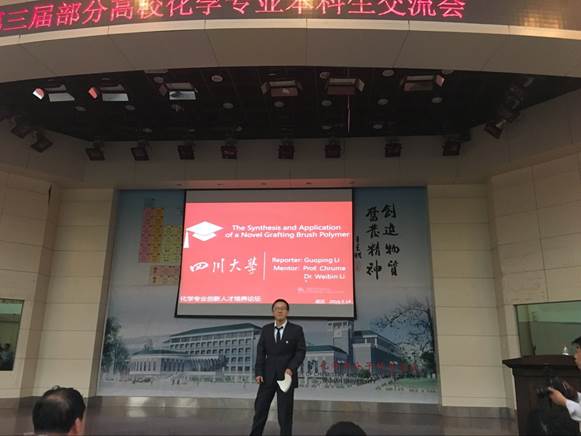 2013级本科学生黎郭平以“The Synthesis and Application of a Novel Grafting Brush Polymer”为题,做了全英文科研报告,并最终获得大会交流报告一等奖。