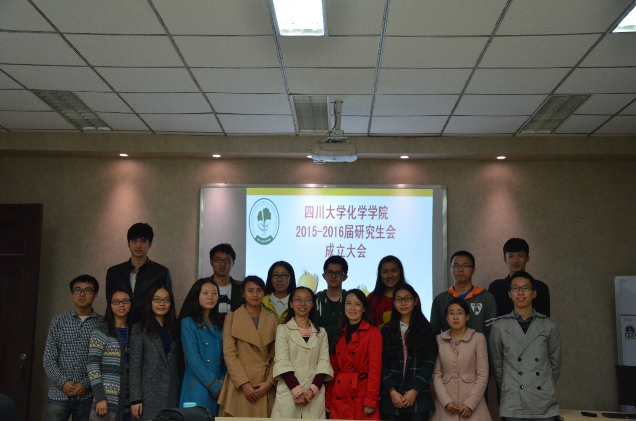 2015-2016届研究生会成立大会在化学馆122召开,学院党委副书记谢均老师、学院分团委书记来俏老师、前任化院研分会主席焦燕同学与本届巴卡漫画