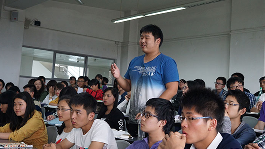 朱清时院士从“生命游戏”引入元胞自动机。元胞自动机是研究复杂系统行为的最初理论框架,也是人工智能的雏形。其基本思想就是一个系统的各个部分之间的相互作用,可以用很简单的规则来表示,不同的规则产生不同的演化方式,这样运行下去,就产生出复杂的整体效果。它表明世界上存在的结构和秩序可以用一些很简单的规则产生出来。朱院士的学术报告讲解幽默风趣,逻辑清晰。从简单的“生命游戏”深入到宇宙是否为幻像,什么是运动,什么是物质。一系列对于世界最原始的思考激起了在座师生的浓厚兴趣,大家都积极地思考提问。报告结束之后,朱院士与巴卡漫画