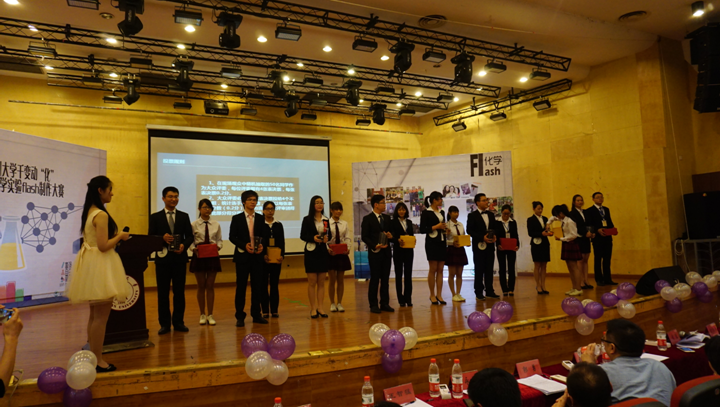 本次大赛于2015年4月12日14:00在望江校区文华活动中心隆重举行了决赛暨颁奖典礼活动。参与决赛的8个团队相继进行了团队介绍,并展示了他们的Flash作品。评委们也逐一进行了幽默又不失专业的点评,同学们在感叹参赛选手们Flash制作技术的精良的同时也从评委们的点评中学到了更多的化学知识。