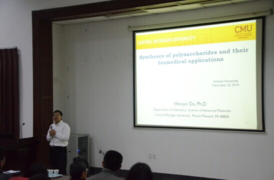 并进行学术交流。在化学馆321报告厅,杜文军教授做了题为“化学合成多糖以及他们的生物医学应用”的学术报告。他介绍了该课题组近几年合成各种多糖大分子上取得了较为突出的研究结果,并进一步讲解了所合成的多糖在生物医学上的相关最新研究进展。余孝其院长主持了报告会,李坤、于珊珊等研究人员到场听取了报告。杜教授报告内容新颖,讲解深入浅出,激起了在座老师和同学的浓厚兴趣。报告结束后,杜教授与学院部分师生进行了交流和讨论。