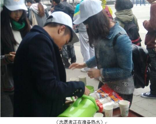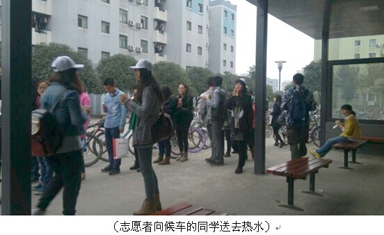 “阳光”青年志愿者服务队9名志愿者于今晨7:00搬了桌子、提了热水壶来到了江安校车站安置好一切物品后为等车的同学送上热水。装着热水的纸杯从志愿者手中传递到等车的同学手中,是温暖的传递更是奉献自我、关怀他人的志愿者精神的传递。“阳光”青年志愿者服务队表示本活动将在每周进行,使这样的温暖传递给更多的同学,同时也为更多的志愿者提供服务的机会。