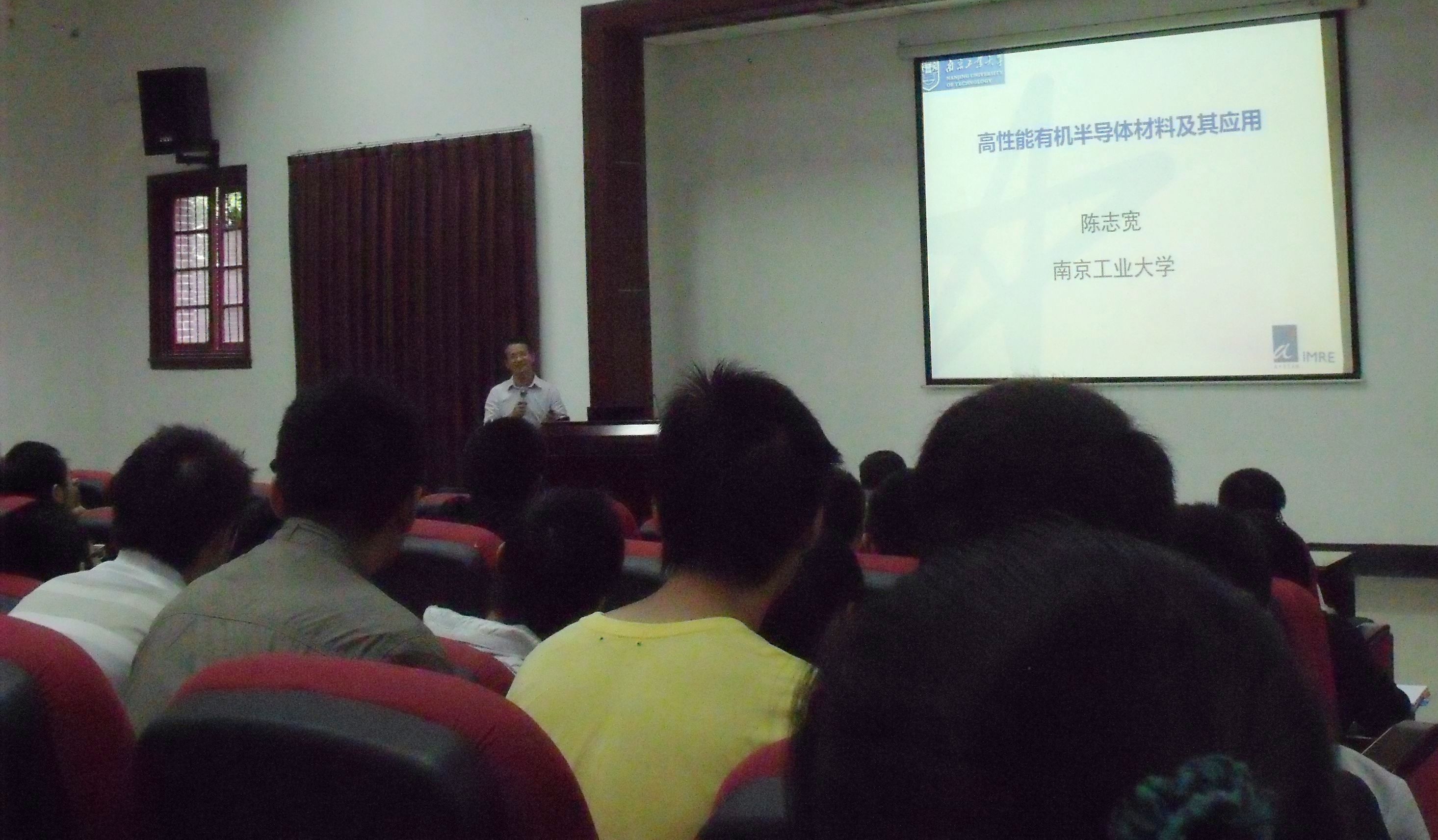邀请,在化学馆321报告厅,作了题为《Development of High Performance Organic Semiconductors for Organic Electronics》的学术报告。陈教授分别从有机电致发光、有机光伏和有机场效应晶体管三个方面介绍了他们课题组在三类有机光电材料的设计制备和器件应用方面的研究工作,很多结果至今还保持着国际领先的水平。随后,陈教授还介绍了南京工业大学先进材料研究院的筹建情况,热忱欢迎立志于从事有机光电的老师和学生的合作和加盟。最后,陈教授还与参会老师和同学就本领域的一些热点问题开展了交流讨论。陈志宽教授简介:南京工业大学先进材料研究院教授,博士生导师。1989年毕业于北京大学,获得应用化学专业学士学位,并分别于1992、1995年获得北京大学有机化学专业硕士及博士学位。1995年,加入新加坡国立大学化学系从事博士后工作,1998年加入新加坡材料研究与工程研究院从事有机电子学的研究。在研究院工作期间,历任研究员,高级研究员,首席科学家,产业化项目负责人。2002年至2006年间任“分子与功能材料部”副主任;2007年至2010年间任“合成与集成部”副主任;2011年任“合成与集成部”主任。2006年至2010年间担任新加坡南洋理工大学材料与工程学院兼职副教授;2011年至2012年间担任新加坡国立大学化学系兼职教授。同期担任新加坡多家公司的首席技术顾问。陈教授主要从事有机光电材料的设计与合成、材料光电特性及薄膜特性、材料的器件特性及其与材料结构的构效关系研究,同时也探索器件制程、器件物理、器件集成等方面的研究。