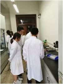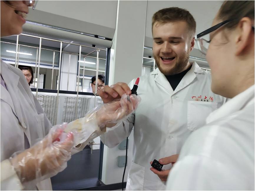 7月5日,留学生们再次来到实验室,创意化学社干事们先向他们演示了火焰掌实验,留学生们也都尝试了一下“被火烧”的感觉。接下来留学生在干事的指导下做了蓝金雨和史莱姆,他们对最后的成品都非常满意,并带回留作纪念。