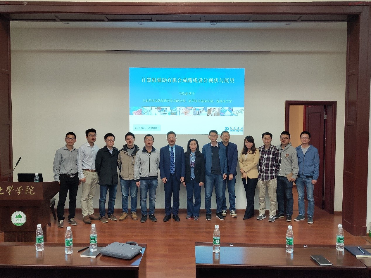 ,并在化学馆321报告厅做了题为“计算机辅助有机合成路线设计现状与展望”的学术报告。马汝建博士首先跟大家分享了药明康德新药开发有限公司的发展历程,然后介绍了有机合成路线设计方法的发展历程。随后马汝建博士介绍了当前已有有机合成路线设计辅助软件现状及面临的挑战。最后通过“人机对比”,对软件进行测试,进行详细介绍了Ackos、Synthia、Alphachem这几款有机合成路线设计辅助软件的优缺点,并对计算机辅助有机合成路线设计进行了展望。在报告过程中,马汝建博士语言幽默风趣,讲解深入浅出,激起了在座老师和同学的浓厚兴趣。在提问环节,马汝建博士与参会的师生进行了热烈的交流和讨论。