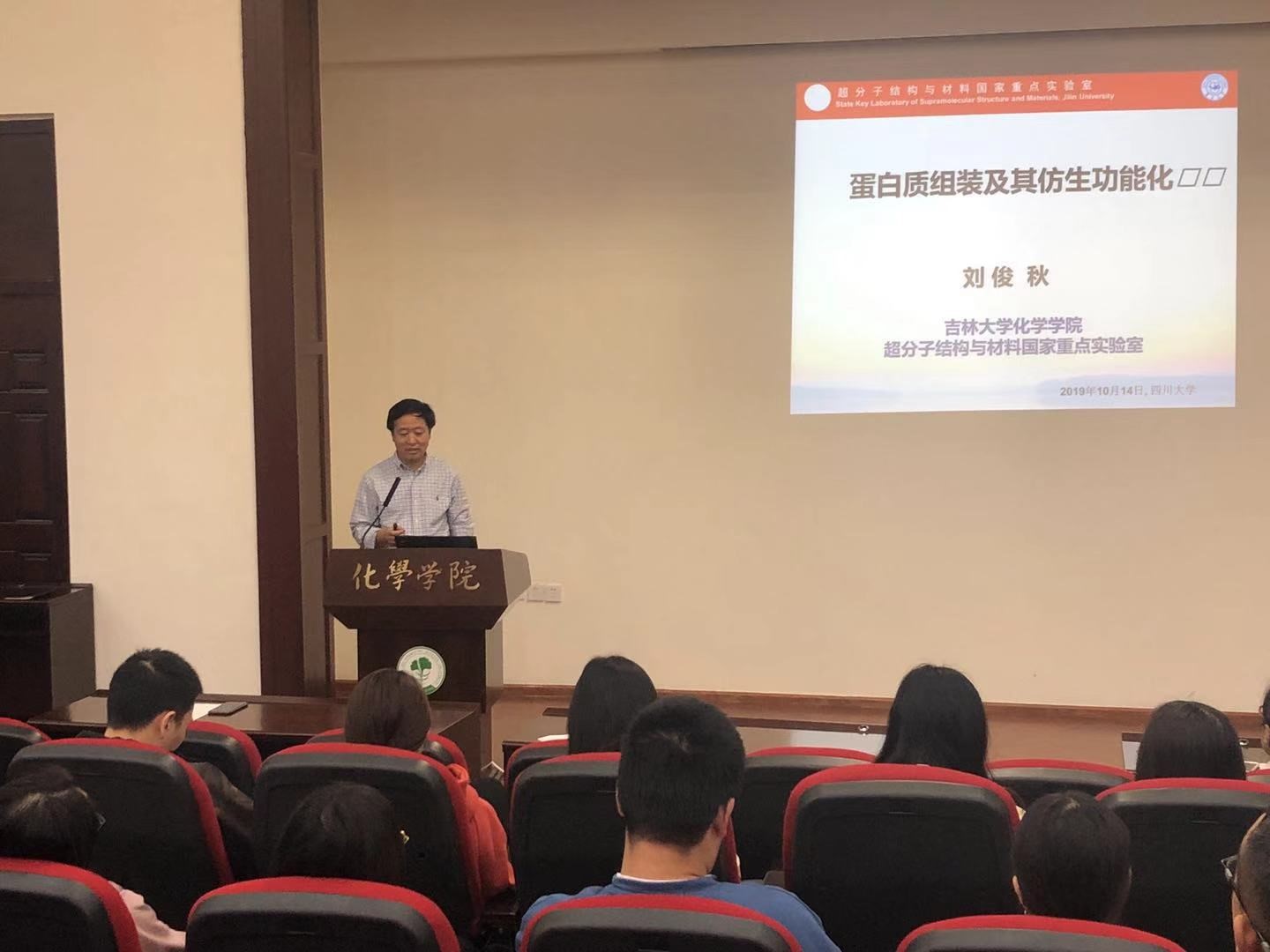 构筑的多维多样化的蛋白质功能组装体,研究弱相互作用的协同性,实现对蛋白质组装体结构的调控,是当前重要研究课题。而控制蛋白质自组装方向则是实现蛋白质规则组装的核心问题。对于蛋白质这样大的构筑基元,实现可控自组装需要多重相互作用的协同。在此次报告中,刘俊秋教授为在座师生们介绍了其课题组建立的多种蛋白质多层次多维组装新技术和新方法,为大家详细讲解了他们构筑了多样化的蛋白质组装体及蛋白质杂合组装体的过程。为了实现蛋白质组装体的功能,刘俊秋教授在蛋白质组装体上构筑了多酶活性中心,实现了多酶串联与协同催化,并成功实现了对光捕获系统的仿生模拟。此外,刘俊秋教授利用分子的自组装,构建了具有K+选择性的仿生物膜通道。