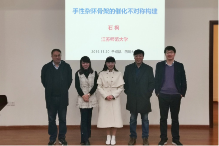 在此次报告中,石枫教授围绕她们课题组近年来基于吲哚母核发展的多种吲哚衍生杂环化合物的不对称构建进行了报告。该课题组通过设计吲哚烯、吲哚醇和芳基吲哚这三类平台分子,进而对平台分子参与的不对称反应展开研究,实现了多个结构复杂的吲哚杂环骨架的高效构筑,同时发展了基于吲哚骨架的轴手性化合物的不对称合成方法。此外,他们也将合成的吲哚杂环化合物进行生物或药物活性测试,体现了一定的实际应用潜力。石老师的报告内容丰富,条理清晰,讲解深入浅出,引起了师生们的广泛兴趣。报告后,在场师生与石老师进行了深入的交流和讨论。报告在大家的热烈掌声中落下帷幕,结束后部分老师与石枫教授合影留念。