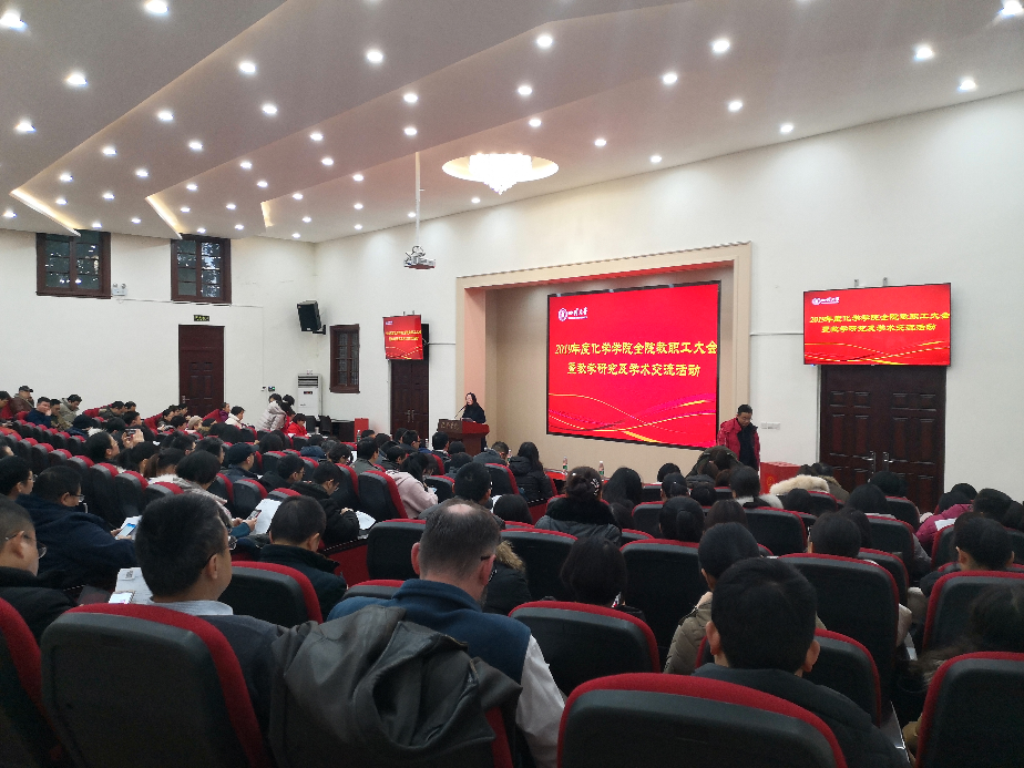 在望江校区化学馆321举行2019年度全院教职工大会。学院全体教职工参加会议,会议由学院副书记谢均主持。