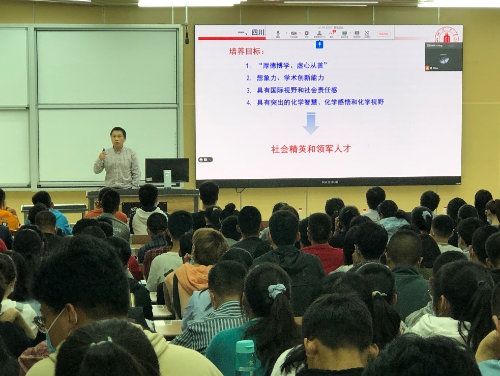 大家庭表示了热烈的欢迎。他简洁明了地给学生和家长介绍化学的办学历史,并殷切希望化学学子能脚踏实地、勤奋进取,尽情享受好时光,青春年华不虚度。游院长也给新生提出了以下三点建议:第一,要培养家国情怀,勇担社会责任;第二,要树立科学精神,培养创新意识;第三,要做好人生规划,践行自主学习。