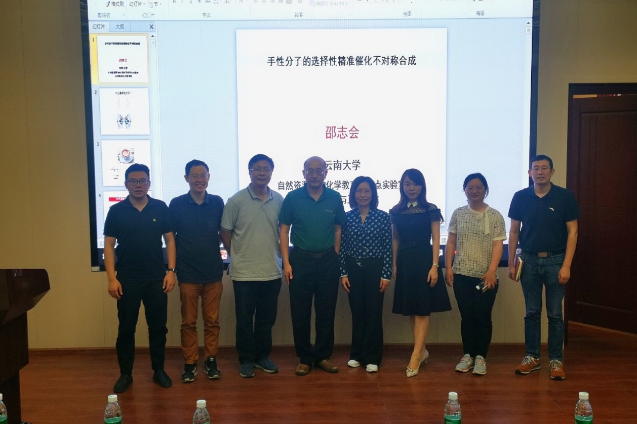 在此次报告中,邵志会教授主要介绍了他们课题组近年来围绕手性伯胺类催化剂的设计开发和应用,实现了多种手性分子的不对称精准构筑,随后也开展了金属催化的杂环化合物的发散性合成。他们通过调控配体或者催化剂的微结构,精准地实现了多个反应的立体选择性和区域选择性的多样性合成。此外,邵老师将发展的有机合成新方法成功应用于多种天然产物和手性药物及其中间体的高效简洁合成。邵老师的报告内容丰富,条理清晰,讲解深入浅出,引起了师生们的广泛兴趣。报告后,在场师生与邵老师进行了深入的交流和讨论。报告在大家的热烈掌声中落下帷幕,结束后部分老师与邵志会教授合影留念。