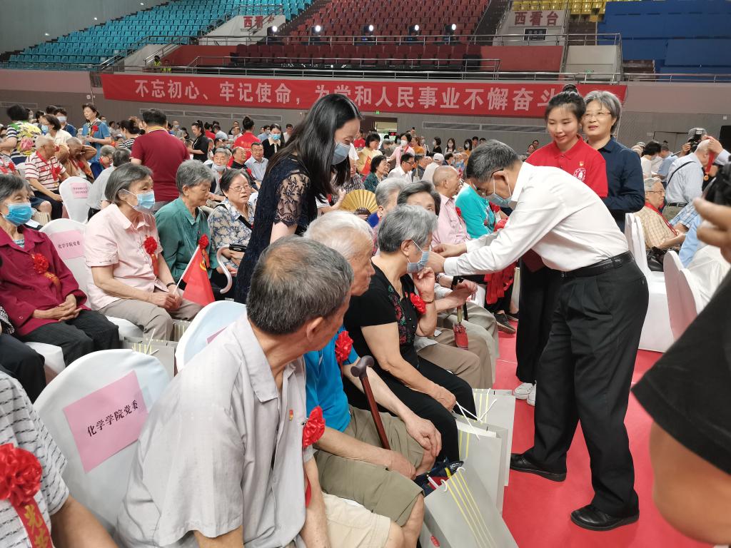 老党员颁发“光荣在党50年”纪念章,同他们一一握手,向他们表示热烈祝贺和崇高敬意,向他们在不同时期为党的事业和学校改革发展稳定作出的积极贡献表示感谢。