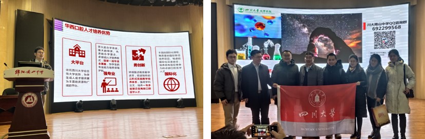 的办学历史、学科建设、学生培养等方面全方位展示了化学专业的特色和优势,着重介绍了化学强基计划招生和培养模式。商学院李小平副书记以商学院的教学理念为切入点,介绍了学院的学科体系、师资队伍及本科教育特色,阐释了商学院“行健厚德,格商致道”的院训内涵;华西口腔医学院张雪峰医生从介绍口腔医学的概念入手,讲述了口腔医学的行业现状和人才缺口,结合华西口腔人才培养的优势和近几年录取情况,鼓励南山学子积极报考。