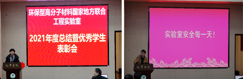 环保型高分子材料国家地方联合工程实验室于化学馆321报告厅举行了年度工作总结暨表彰大会。会议由环保实验室党支部书记汪秀丽教授主持,实验室全体师生参加了此次大会。