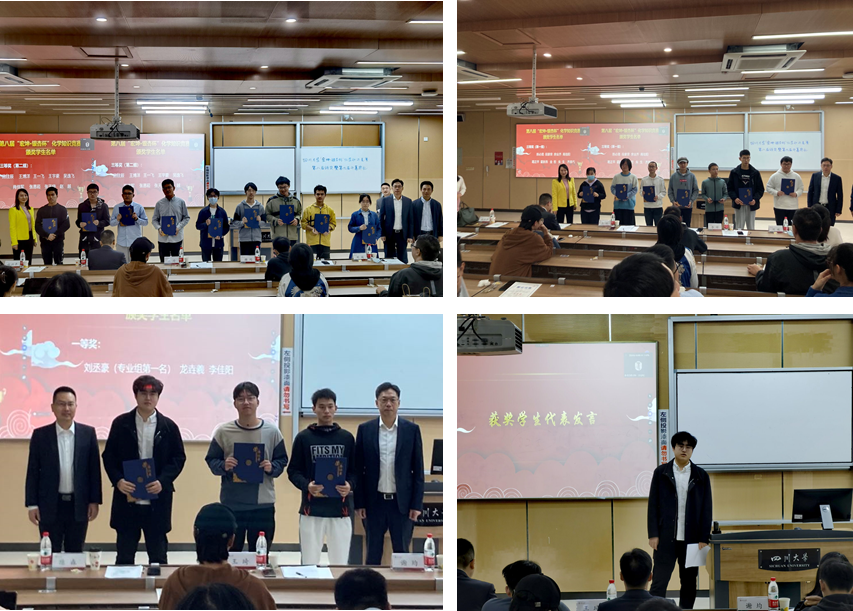 党委副书记肖波老师宣读获奖名单,到场嘉宾共同为获奖同学颁奖。获奖学生代表刘丞豪上台发言,表达了对学校、宏坤集团的感谢,分享了自己学习化学的感悟。