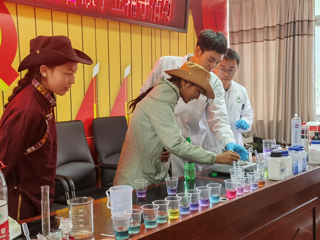 团队成员在壤古村、吾伊乡开展多场交流分享和化学科普活动。团队成员通过叙求学之路、论学习方法、展大学生活,激发当地青少年的求学热情,助力当地学生从思想上走出大山。随后,团队成员充分发挥专业特长、展现专业特色,为当地学生展示了多个化学趣味实验,激发当地学生对科学的探索热情,助力当地科学知识普及和普通话推广。