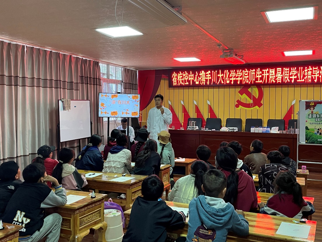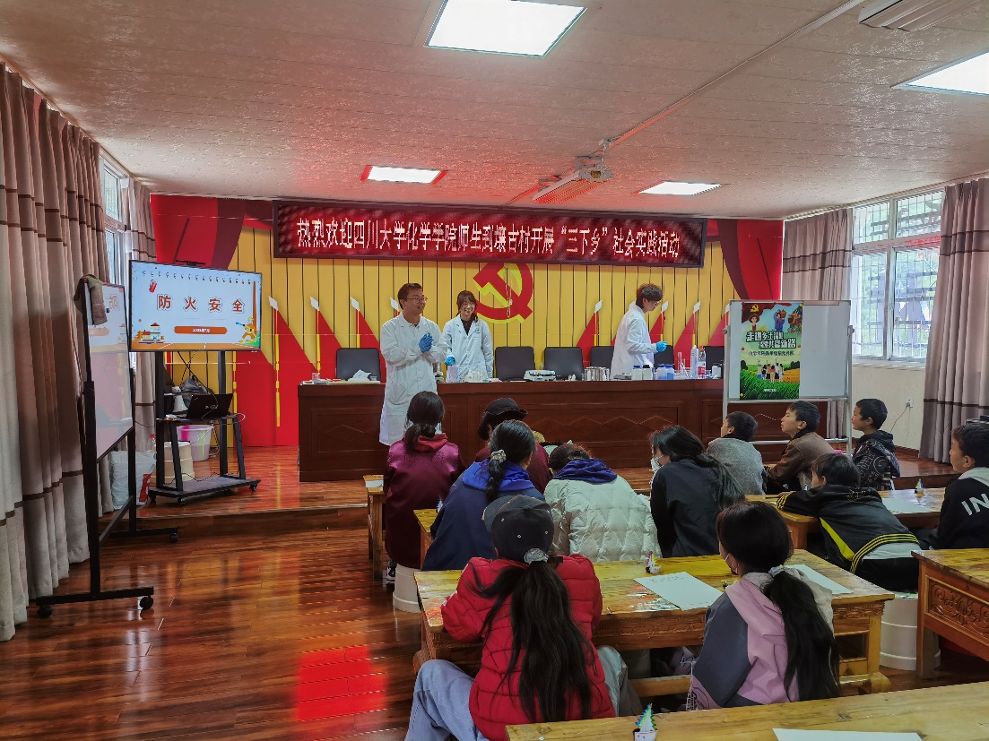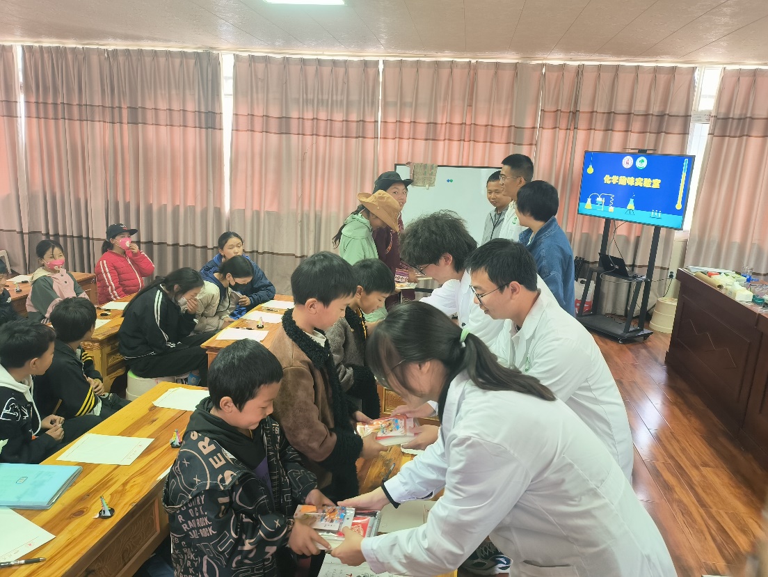 团委副书记张若一、研究生辅导员浩涛涛带领团队成员走进大山,深入走访调研,开展化学科普实验,辅导学生课程作业,助力推广普通话,用实际行动助力乡村振兴事业。