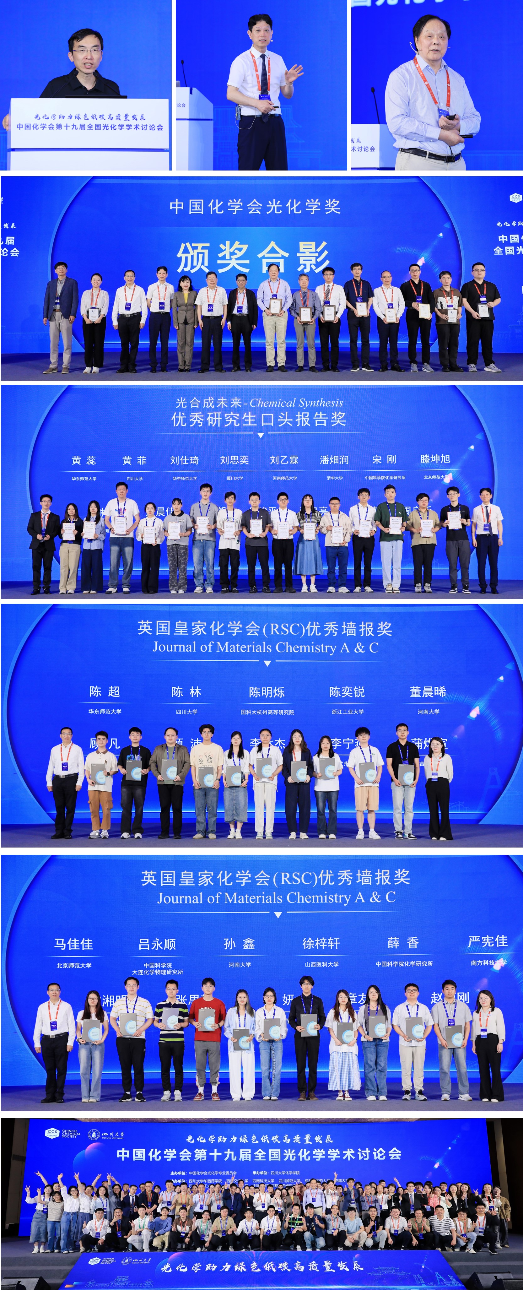 4月20日下午,上海交通大学樊春海院士和武汉理工大学/比利时那慕尔大学苏宝连院士分别做大会报告,之后举行了会议闭幕式。本次会议颁发第一届“中国化学会光化学奖”。中国科学院理化技术研究所佟振合院士获“中国化学会光化学卓越贡献奖”并做获奖报告,华中师范大学肖文精教授和中国科学院理化技术研究所张铁锐研究员获“中国化学会光化学杰出贡献奖”,北京大学樊新元副教授、清华大学徐江飞副研究员和南开大学徐加良教授获“中国化学会光化学青年创新奖”,华东理工大学燕宸旭特聘副研究员、香港中文大学万晴云助理教授和华南理工大学俞越副研究员获“中国化学会光化学青年新锐奖”。另外,本届会议共评选出15个“光合成未来-Chemical Synthesis优秀口头报告奖”和21个“英国皇家化学会(RSC)墙报奖”,彰显了光化学研究领域的人才辈出,欣欣向荣。本次会议结束后,与会专家盛赞本次会议的成功举办,对参与会议组织工作的老师和同学们表示衷心的感谢。