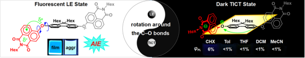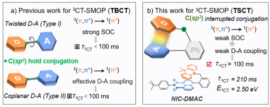 1. 提出以“面包夹”型纯有机空间电荷转移分子来获得长寿命、高能量的电荷转移三重激发态