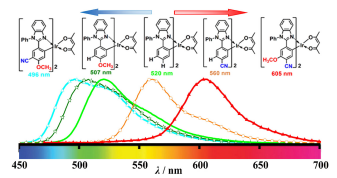18.Yan Jiao, Ming Li, Ning Wang, Tao Lu, Liang Zhou,* Yan Huang, Zhiyun Lu,* Daibing Luo, Xuemei Pu.* A facile color-tuning strategy for constructing a library of Ir(III) complexes with fine-tuned phosphorescence from bluish green to red using a synergetic substituent effect of –OCH3 and –CN at only the C-ring of C^N ligand, J. Mater. Chem. C, 4, 4269-4277, 2016.