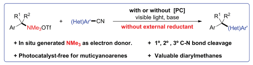 87.M. Miao, L.-L. Liao, G.-M. Cao, W.-J. Zhou,* D.-G. Yu*, Visible-light-mediated external-reductant-free reductive cross coupling of benzylammonium salts with (hetero)aryl nitriles. Sci. China Chem. 2019, 62, 1519. (Invited Contribution to SPECIAL ISSUE: Organic Free Radical Chemistry)