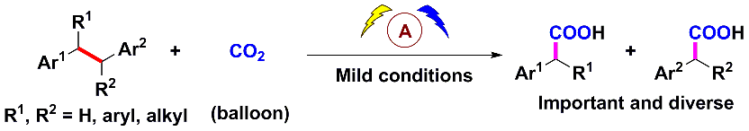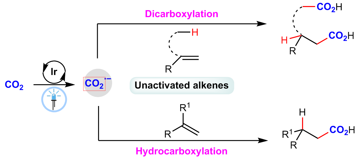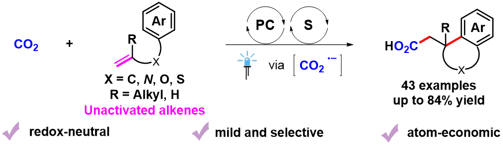 50.L. Song,† W. Wang,† J.-P. Yue, Y.-X. Jiang, M.-K. Wei, H.-P. Zhang, S.-S. Yan, L.-L. Liao, D.-G. Yu*, Visible-Light Photocatalytic Di- and Hydro-Carboxylation of Unactivated Alkenes with CO2. Nat. Catal. 2022, 5, 832 († Equal contribution)