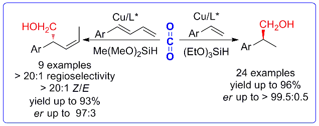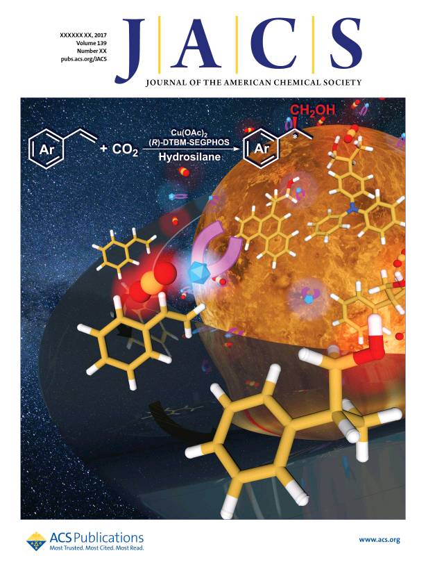 108.Y.-Y. Gui,† N. Hu,† X.-W. Chen, L.-L. Liao, T. Ju, J.-H. Ye, Z. Zhang, J. Li, D.-G. Yu*, Highly Regio- and Enantioselective Copper-Catalyzed Reductive Hydroxymethylation of Styrenes and 1,3-Dienes with CO2. J. Am. Chem. Soc. 2017, 139, 17011. († Equal contribution. Cover. Top 4 most read JACS papers in November, 2017. Highlighted by Synfacts 2018, 14, 0177, CJOC, X-MOL, OPR&D and Organic Chemistry Portal)
