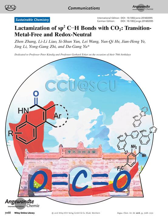 120.Z. Zhang, L.-L. Liao, S.-S. Yan, L. Wang, Y.-Q. He, J.-H. Ye, J. Li, Y.-G. Zhi, D.-G. Yu*, Lactamization of sp2 C─H Bonds with CO2: Transition-metal-free and Redox-neutral. Angew. Chem. Int. Ed. 2016, 55, 7068. (扉页文章,Highlighted by Synfacts、X-MOL以及《有机化学》亮点介绍)