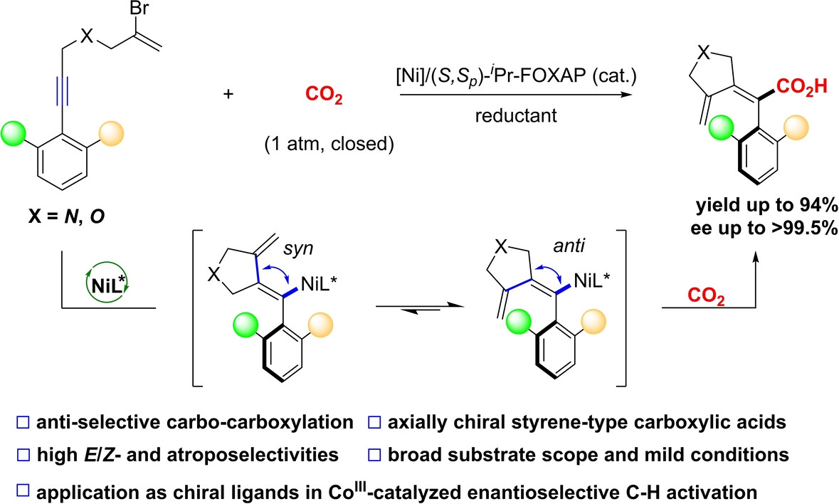 3.Chao Li,† X.-W. Chen,† L.-L. Liao,† Y.-Y. Gui*, J.-W. Yang, S. Zhang, J.-P. Yue, X. Zhou*, J.-H. Ye, Y. Lan, D.-G. Yu*, Nickel-Catalyzed Atroposelective Carbo-Carboxylation of Alkynes with CO2: En Route to Axially Chiral Carboxylic Acids. Angew. Chem. Int. Ed. 2025, 64, e202413305. († Equal contribution. Hot Paper. Highlighted by化学深耕堂、X-Mol、CBG、有机文献速览、微算云平台)