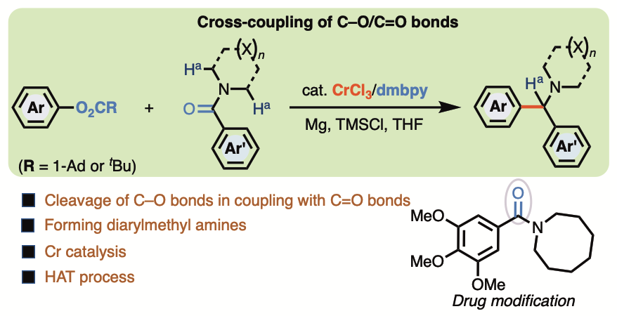基于铬金属有机催化多局限于高中价态金属催化的研究现状,课题组聚焦构建铬低价金属催化体系,围绕“铬-底物/配体配位与控制反应选择性的关系”等问题展开研究,针对“铬金属催化活性低、较难发生双电子转移基元反应”的领域挑战、以及合成化学中存在的惰性碳-杂键活化与不饱和键转化的选择性调控难题,利用底物或配体结构中亚胺、单氨基卡宾或取代联吡啶的电子及位阻效应调节铬金属中心的催化反应性质,实现了一些惰性碳-杂键转化及不饱和键加氢还原的选择性控制。作为主要贡献人分别在Chem. Rev., Nat. Synth., J. Am. Chem. Soc., Angew. Chem. Int. Ed., Nat. Commun.等刊物上发表多篇研究论文。