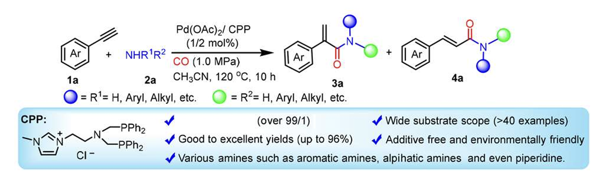 9. Dai, C.; Chen, Y.; Xu, J.; Zheng, X.; Chen, H.; Fu, H.*; Li, R.* Highly selective and additive-free Pd(OAc)2/CPP catalyzed hydroaminocarbonylation of alkynes. Org. Biomol. Chem., 2024,22, 5534-5539