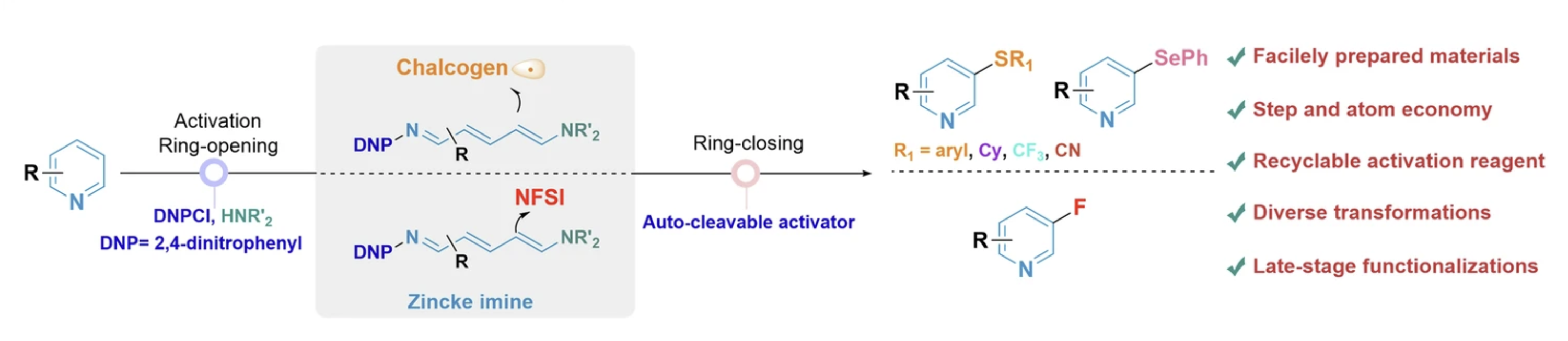 5. Li, S.; Tang, J.; Shi, Y.; Yan, M.; Fu, Y.; Su, Z.; Xu, J.; Xue, W.; Zheng, X.; Ge, Y.; Li, R.; Chen, H. *; Fu, H. *, C3 Selective chalcogenation and fluorination of pyridine using classic Zincke imine intermediates. Nature Commun. 2024, 15 (1),7420