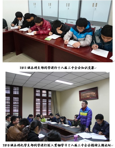 各年级均把学习宣传贯彻党的十八届三中全会精神作为教育宣传工作的重点,积极利用“形势与政策”课,QQ群、微信、微博、飞信、人人网等新媒体,向广大同学宣传十八届三中全会会议主要内容;利用党组织生活进行交流讨论,联系学生实际出发,重点学习讨论了《中共中央关于全面深化改革若干重大问题的决定》中的十六项重要决定,《中国共产党第十八届中央委员会第三次全体会议公报》,《十八届三中全会专题》,让学生领会到关于全面深化改革的总体思路和具体举措,切实体会到十八届三中全会公报内容。