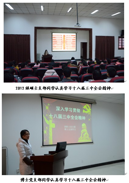 各个支部积极组织全体党员同学认真学习十八届三中全会会议精神,同时成立了“中国特色社会主义理论研究分会”学习小组,围绕《中共中央关于全面深化改革若干重大问题的决定》、习近平总书记一系列讲话等内容,对全体党员同学进行宣讲辅导,力求全面深入地宣传党的十八届三中全会精神,引导学生深刻领会、准确把握党的十八届三中全会的精神实质。