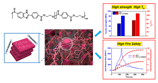 近日,我室在前期研究基础上提出了“氢键交联”的聚酯阻燃抗熔滴策略,通过分子设计合成了一种含苯并咪唑结构的PET共聚酯。由于自身特殊的结构特点,在氢键和π-π堆积作用的驱动下,苯并咪唑基团能够在共聚酯分子链中形成纳米尺度的聚集体,起到可逆的物理交联网络的作用,进而抑制PET分子链的自由运动。经变温红外、变温XRD以及一系列的剪切和拉伸流变等测试验证,该物理交联网络在共聚酯熔体状态下依然能够保持,因而使得共聚酯熔体表现出较高的零剪切黏度和熔体强度,从而能够抑制熔滴现象的产生。同时,苯并咪唑基团能够促进共聚酯在燃烧时快速形成稳定的炭层,使共聚酯表现出良好的成炭性和自熄性。因此,共聚酯的熔体强度和成炭性都得到了提高,从而赋予共聚酯高效的阻燃和抗熔滴效果,解决了聚酯阻燃和抗熔滴相矛盾的难题。此外,与其他阻燃抗熔滴共聚酯体系相比,由于可逆氢键交联网络的存在,该共聚酯体系表现出了更高的玻璃化转变温度和拉伸强度,有望进一步拓展PET基聚酯的应用范围。