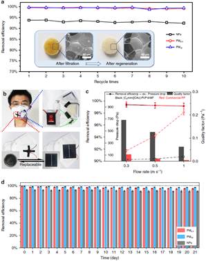 为实现材料的实际应用,研究人员尝试将搭载ILP材料的过滤设备安装到口罩上,结合纽扣锂电池或者是太阳能电池板,制备了一种新型自供能过滤面罩。在无需外部电源情况下,制备了便携式的高效头戴式空气过滤设备。通过研究表明,该设备具有一个良好的长期稳定性,与商用口罩对比,具有更好的颗粒去除效果。