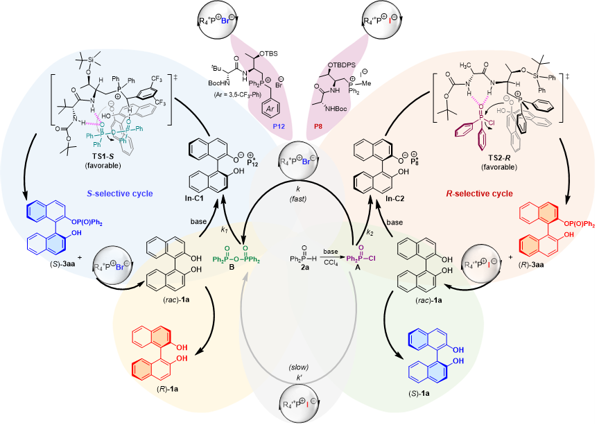 王天利教授课题组一直致力于手性肽-季鏻盐催化的不对称合成化学研究,开发了一系列新型高效的多功能手性肽-季鏻盐催化剂、及其催化的新合成方法学。针对上述科学挑战,该团队利用二肽-季鏻盐作为手性催化剂,通过对催化剂骨架尤其是对催化剂负离子的微调,发展了季鏻盐调控识别A-T反应体系中不同亲电磷中间体的新策略,首次实现A-T反应介导的轴手性二酚及氨基酚类化合物的立体发散型不对称拆分。机理研究表明:催化剂季鏻盐调控了氧磷化合物P(O)-H经A-T历程生成不同的主要磷活性中间体A(磷酰氯)和B(磷酸酐),这两类主要中间体被季鏻盐识别后进入不同的催化循环实现不同的立体选择性拆分反应(S-selective cycle 和R-selective cycle),由此获得构型相反的拆分产物和底物,并释放出催化剂进入下一个催化循环。