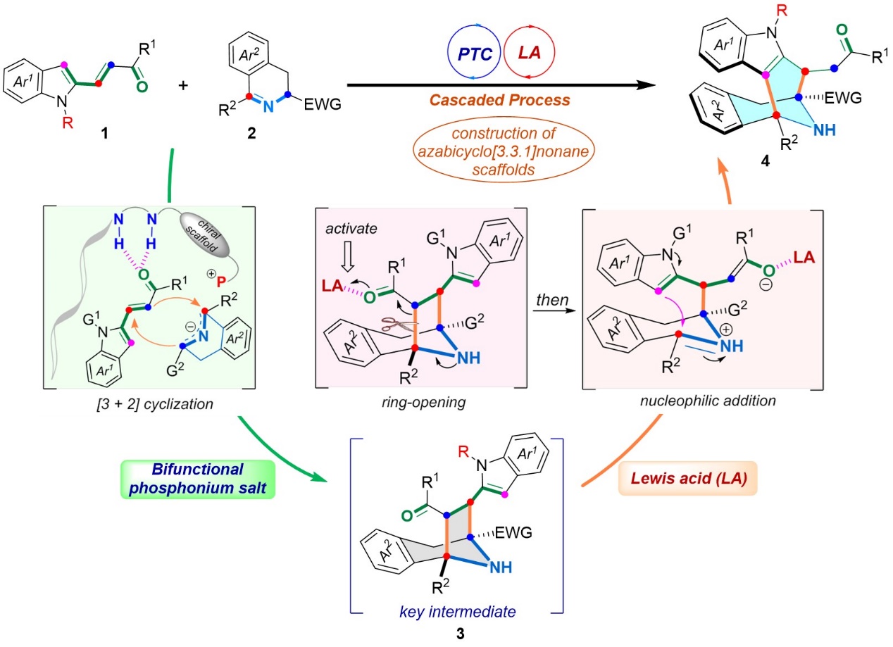 王天利课题组一直致力于手性肽-季鏻盐催化的不对称合成化学研究,开发了一系列新型高效的手性肽-季鏻盐催化剂,并成功用于若干富有挑战的有机反应中(例如Angew. Chem., Int. Ed. 2019, 58, 7425-7430;Angew.Chem. Int.Ed. 2021, 60, 14921-14930;Angew. Chem. Int. Ed. 2021, 60, 19860-19870等)。针对上述科学问题并结合课题组前期在构建手性[3.2.1]氮杂七元桥环的研究基础 (Sci. China Chem. 2020, 63, 1091-1099),最近该课题组首次利用双功能季鏻盐催化剂和路易斯酸接力催化策略,以季鏻盐催化串联环化反应得到七元桥环中间体,随后路易斯酸促进该中间体原位开环/扩环,高效高立体选择性的构建了具有多个手性中心的[3.3.1]型氮杂八元桥环骨架。