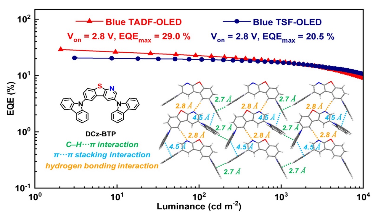 基于“伪”对称结构的双咔唑类DCz-BTP主体材料的蓝光OLED展现出更为优异的器件性能。将DCz-BTP用作主体,作者成功制备了低电压、高效率的蓝光热活化延迟荧光OLED(TADF-OLED:Von = 2.8 V, V1000 = 4.2 V, EQEmax = 29.0%, PEmax = 48.2 lm W-1)和蓝光超敏荧光OLED(TSF-OLED:Von = 2.8 V, V1000 = 4.2 V, EQEmax = 20.5%, PEmax = 34.7 lm W-1),揭示了吡啶并苯并噻吩结构在构筑蓝光OLED主体材料方面的巨大潜力。