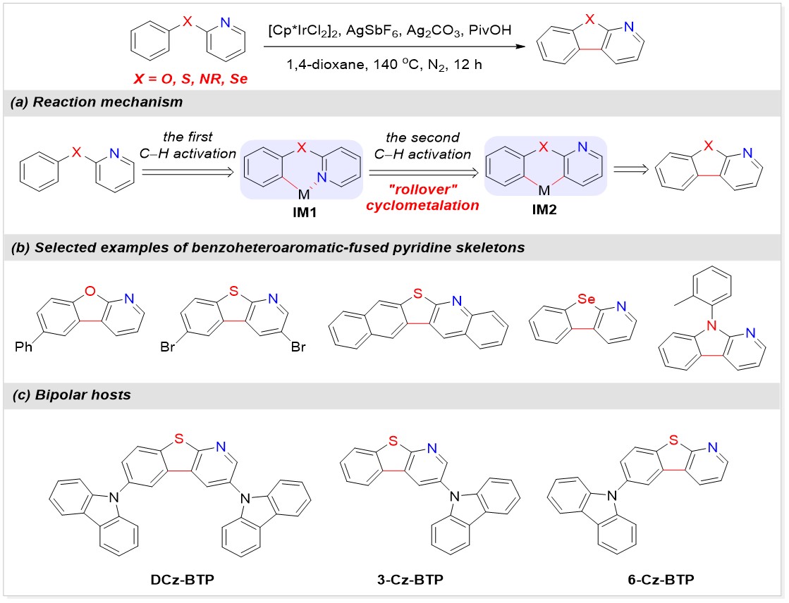 游劲松教授、宾正杨副研究员团队致力于利用C−H活化策略构筑非传统结构的OLED新材料,以突破OLED材料结构和性能瓶颈。近期,游劲松教授和宾正杨副研究员等基于“翻转环金属化”策略发展了一种铱催化的分子内氧化C−H/C−H偶联反应,高效构筑了吡啶并杂芳环类分子骨架,为蓝光OLED主体材料的开发提供了丰富的分子库。作为一个例子,作者开发了一系列基于吡啶并苯并噻吩结构的双极性主体材料(DCz-BTP,3-Cz-BTP和6-Cz-BTP),其中吡啶环的引入有利于形成强的分子间氢键相互作用,从而显著改善主体材料的传输性能,进而降低器件驱动电压,提高器件效率。