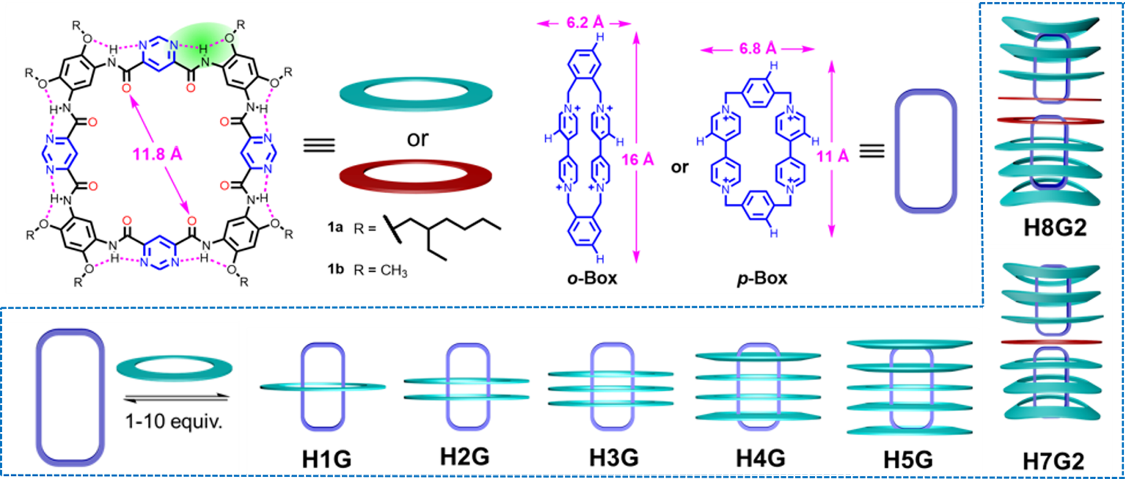 袁立华教授课题组与杨成教授、深圳大学化学与环境工程学院李霄鹏教授合作, 利用含有嘧啶结构单元的氢键芳酰胺大环1a与阳离子环番客体(o-Box/p-Box)成功构筑了一类结构新颖的环套环组装体H4G和H5G及其高阶离散型二聚体H7G2和H8G2。在对环套环主客体复合物的单晶进行解析时,作者发现大环1a骨架发生了一系列连续变化的构象适应特征。此外,阳离子环番客体(p-Box)在H5G中客体表现为与H4G中不同的构象,表明在环套环主客体复合物中,客体也具有一定的构象适应性。环套环体系的构象适应性与整个超分子结构的稳定化有关,而后者取决于体系中多重非共价作用的协同结果。根据此现象,通过控制大环的当量,该团队成功构筑了由七个或八个大环1a与两个o-Box/p-Box组成的高阶复合物,即H7G2和H8G2。在离散型环套环二聚体晶体结构中,多个大环通过调整自身构象以使分子间相互作用力达到最大,以确保H7G2/H8G2型二聚复合物的形成,有效避免了超分子聚合物的形成。这与H4G/H5G中观察到o-Box呈现的两种不同构象相互呼应,表明环套环体系中的构象适应性可以由主、客体双方互相诱导而产生。该研究结果展现出二维氢键大环用于构筑高阶环套环组装体所具有的独特性,有助于理解高阶纳米组装体形成过程中涉及到的界面作用及构象适应性现象。