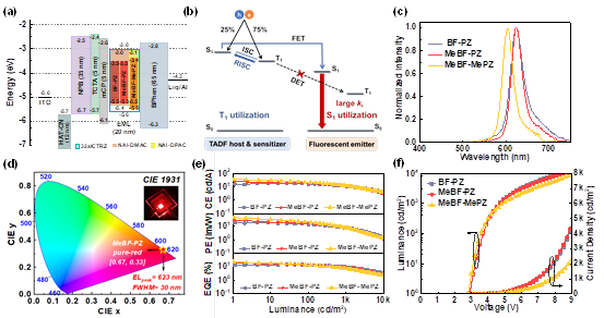 器件结果表明,基于三种材料的TSF-OLEDs均呈现窄光谱红光发射,其中使用MeBF-PZ材料的最大外量子效率(EQEmax)为18.3%,发射波长为623 nm,FWHM为30 nm,其CIE坐标为[0.67,0.33],符合国际照明委员会(NTSC)纯红光的标准。使用MeBF-MePZ材料的EQEmax为21.1%,发射波长为604 nm,FWHM为30 nm。这项工作不仅突出了BODIPY衍生物在构筑窄光谱红光材料方面的重要性,同时也为进一步开发基于传统荧光材料的高性能窄光谱红光OLEDs提供了新的思路。