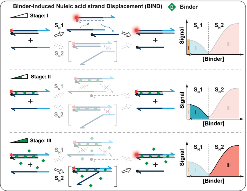 李峰教授课题组以有机反应中亲核取代反应机理的视角,对该经典反应进行审视与重构:经典TMSD反应类似于SN2反应机理,而当环境中缺少金属阳离子时,链置换过程可与SN1路径类比。在此基础上,通过能够与DNA结合的小分子来代金属阳离子去实现链置换过程,并精准调节SN1和SN2反应路径。此类小分子通过插入或沟槽结合的方式与DNA的双螺旋结构结合,能够显著改变DNA的稳定性和功能,而且小分子与双链DNA(dsDNA)之间的相互作用是许多抗癌和抗感染药物的基础。本文中,首先验证了通过此类能够与DNA结合的小分子去介导链置换反应(Binder-Induced Nucleic acid strand Displacement, BIND)。结果显示,小分子与dsDNA的亲和力和其所带电荷能够精准控制链置换反应的路径。随后,进一步将这一全新链置换反应应用于DNA-小分子相互作用的系统、高通量表征,实现了结合常数(Kd)、结合位点大小(n)、协同性(ω)、焓(ΔH)和熵(−TΔS)的贡献以及序列选择性一系列特征参数的一站式综合分析。BIND还可以被设计成高通量筛选的工具,从大量化合物中筛选与DNA有特异性亲和作用的小分子化学物,并成功地从含有700个化合物的库中筛选出8个全新的DNA结合小分子。