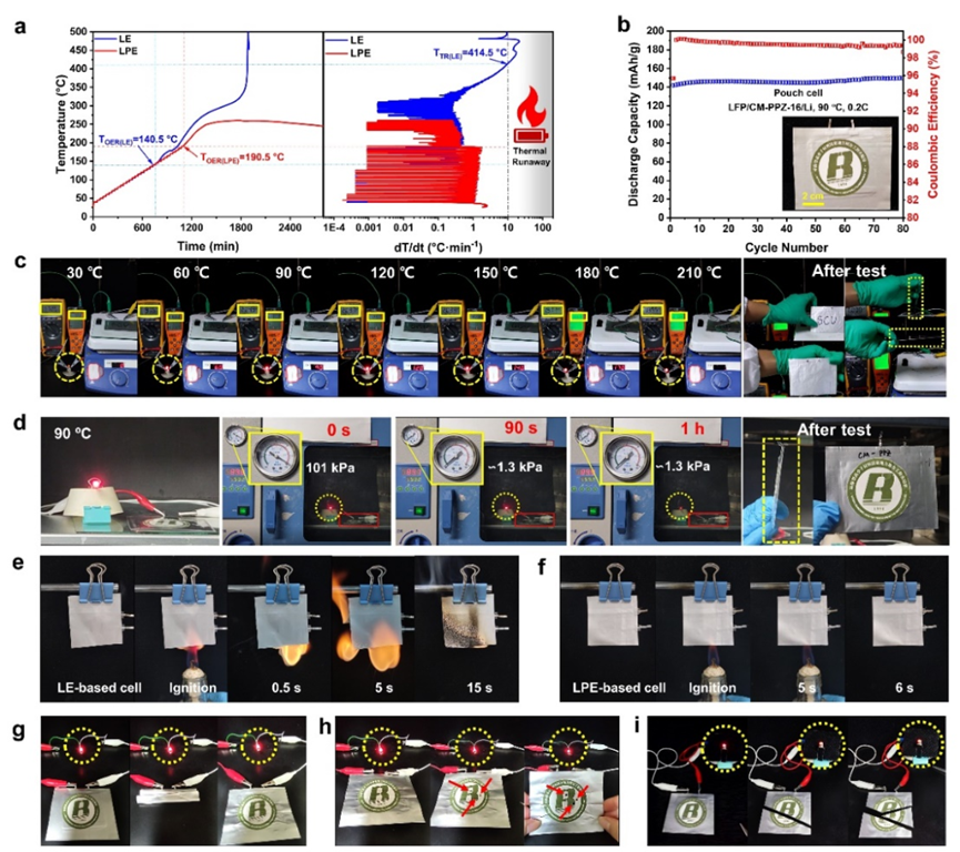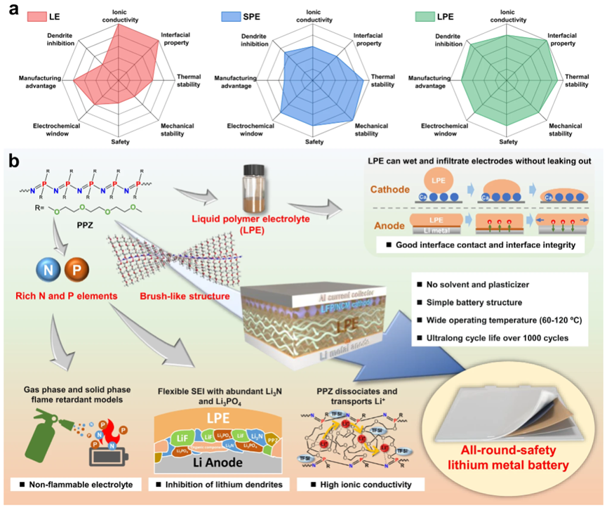 固态聚合物电解质(SPE)是公认的可作为目前普遍采用的低安全性的小分子有机液态电解质(LE)未来的潜在替代者之一,在高比能的锂电池中极具发展前景。然而,其实际应用面临界面性能差和离子电导率低两大关键挑战。现有的解决策略主要是在SPE中引入适量有机溶剂或增塑剂,但这违背了其安全性设计的初衷。因此,高比能锂电池在发挥性能优势的前提下高效解决火、热安全问题,成为实现其大规模实际应用的关键。最近,王玉忠院士团队从SPE和LE的各自特点出发,取二者之长,补其短,提出了不含任何小分子溶剂和增塑剂的室温液态聚合物电解质(LPE)的理念(图1a)。基于分子结构设计,该团队成功合成了具有磷腈主链和甲氧基三乙氧基侧链的室温下液态的刷状聚合物分子PPZ。将PPZ与锂盐复合制备得到了液态聚合物电解质LPE。相比于传统SPE和LE,LPE表现出优异的综合性能和多功能性(图1b),即:PPZ主链结构中丰富的N、P元素赋予了LPE不燃性,同时参与形成富Li3N和Li3PO4的SEI层,使得SEI层具有柔性、热稳定性和良好的离子迁移能力,进而显著抑制了界面副反应和锂枝晶生长;含醚氧基的致密侧链避免了聚合物分子的链缠结和结晶,确保了更好的链段运动能力,以及N、O原子通过配位对锂盐解离、运输的促进作用;室温粘性可流动的特点,使得LPE不仅能够很好的浸润活性电极颗粒,并维持界面完整性,而且在高温和机械滥用时又不会从电池中泄漏。基于此,LPE赋予了锂电池优异的稳定性、循环性能及防火、耐热、耐真空、耐机械滥用等多方位的安全性。这项工作为锂电池面临的一系列安全问题提供了全新的解决思路。