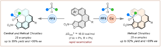 王天利教授团队通过对有机反应进行巧妙和理性设计,以手性肽-季鏻盐作为有机催化剂,利用不对称phospha-Michael加成反应、以及phospha-Michael加成/铜催化氧化芳构化串联两种反应策略,以动态动力学拆分方式首次实现了两类新型含磷螺旋手性分子的高效不对称合成。